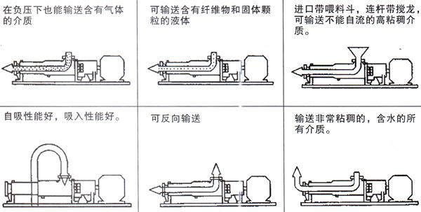 各種粘度的液體,特別是粘稠難輸送的介質(zhì)。各種濃度的液體及經(jīng)過分離脫水的干物料。含有固體顆粒、纖維、懸浮物的液體。液體、氣體、固體的混合物。不能受攪動(dòng)、剪切、掠奪的敏感性液體。腐蝕性液體。