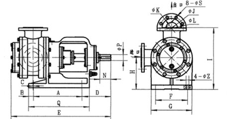 (2)結(jié)構(gòu)如圖1,泵主要有內(nèi)外轉(zhuǎn)子,軸,泵體,前蓋,拖架,密封,軸承等組成。密封械密封和填料密封的兩種形式,對(duì)于高溫、高粘稠度及腐蝕性強(qiáng)的介質(zhì),選用填料密封。輸送易結(jié)晶物料時(shí),在前蓋和泵體上可設(shè)計(jì)帶有保溫夾套,工作時(shí)通蒸汽保溫融化。泵可配閥,當(dāng)泵或管路系統(tǒng)超壓時(shí),閥門打開,形成內(nèi)部回流,系統(tǒng)。泵裝置由泵,電機(jī)和底座組成。傳動(dòng)方式有橋式和直聯(lián)式兩種。從主軸外伸端向泵看,為順時(shí)針旋轉(zhuǎn)。